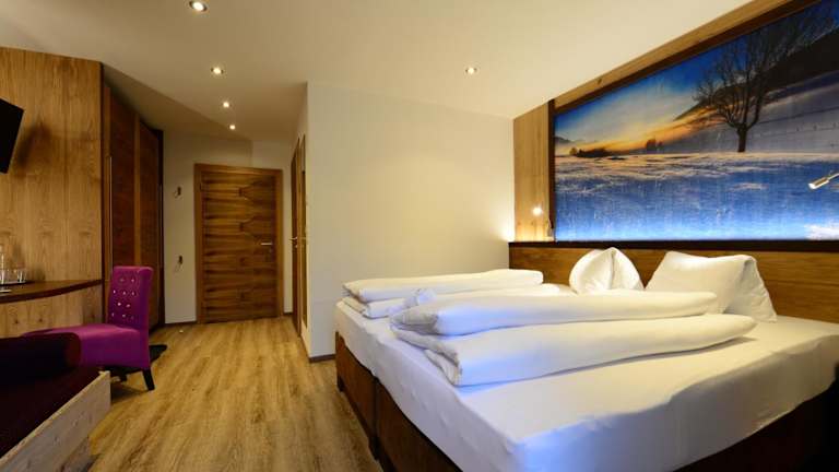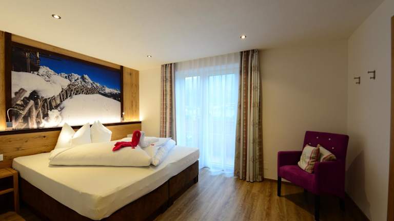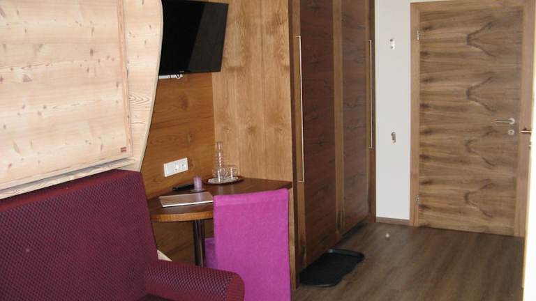 2 Doppel-, 2 Dreibett- und 1 Familiezimmer mit DU/WC, Balkon, Kabel-TV, W-Lan, Safe, Haarföhn; 2 Appartements mit Wohnküche, Bad, WC, Balkon, je 2 Doppel- bzw. 1 Familienzimmer und 1 Mansardenzimmer (Betten hintereinander) für jeweils bis zu 6 Personen;