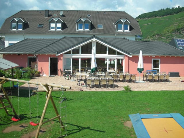 Hier haben selbst Mama und Papa Ferien. Urlaub für Baby, Kinder und Eltern. Die Ferienwohnungen heissen "Pumuckl", "Biene Maja" oder "Mickey Mouse" und gehören zur Ferienresidenz ZickZack, die im romantischen Moseltal zwischen Trier und Benkastel-Kues liegt. Die ca. 60 qm grossen Appartements verfügen über ein Elternschlafzimmer mit Doppel- und Babybett, ein Kinderschlafzimmer mit Etagenbett, Wohnzimmer, komplett eingerichtete Küchenzeile, DU/WC, Balkon oder Terrasse sowie WLan, Sat-TV, Radio und Telefon. Hier können Eltern und Kinder genau den Urlaub verleben, von dem sie schon lange geträumt haben. Ein Halbpension- bzw. All Inclusive - Arrangement bedeutet extra grosse Urlaubsfreude zum kleinen Preis. D. h. schlemmen und trinken nach Herzenslust, eine Familienwanderung durch die Weinberge mit Weinprobe und Weinkellerbesichtigung - viel Spiel und Spass für die ganze Familie. Auf die kleinen und grossen Kids warten u. a. ein grosser Abenteuerspielplatz im Freien mit Bodentrampolin und Kletterkombination, ein Spielstudio mit Kletterdschungel und Bällebad im Haus, Traktorfahrt, Kinderdisco und ein Keller mit TT, Dart, Kicker und Billard. Und damit Mama und Papa auch einmal Zeit für sich haben, gibt es Jessica, eine ausgebildete Erzieherin, die die Kleinen ca. 40 Stunden pro Woche betreut.