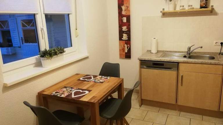 Die Ferienwohnung verfügt über eine gut ausgestattete Küche mit einem Kühlschrank, einem Geschirrspüler und einem Ofen. Essensangebote sind nicht spezifiziert.