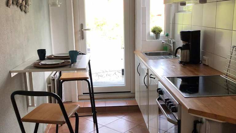 Die Ferienwohnung verfügt über ein Schlafzimmer, ein Wohnzimmer und ein gut ausgestattetes Badezimmer mit Dusche. Zur Ausstattung gehören ein Flachbild-TV, eine gut ausgestattete Küche mit Kühlschrank und Ofen sowie Terrasse und Gartenblick. Handtücher und Bettwäsche werden bereitgestellt.