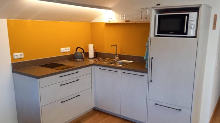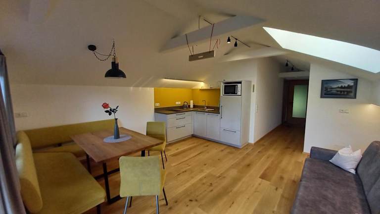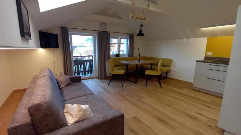 Die Ferienwohnung verfügt über einen Balkon, ein Schlafzimmer, ein Wohnzimmer sowie eine gut ausgestattete Küche mit Kühlschrank und Geschirrspüler. Zudem ist ein TV mit Kabelkanälen vorhanden.