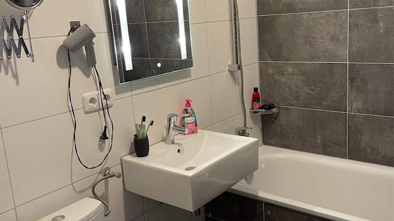 Die Ferienwohnung umfasst ein Schlafzimmer, ein Wohnzimmer mit Flachbild-TV, eine voll ausgestattete Küche sowie ein Badezimmer. Die Einrichtung ist modern und bietet einen Blick auf den Garten. Handtücher, Bettwäsche und Wäsche werden gemäß den Vorschriften der örtlichen Behörden gewaschen.