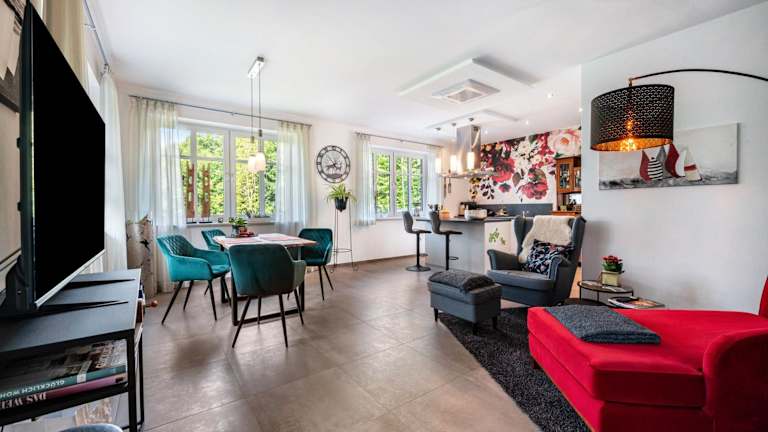 Die Ferienwohnung umfasst 1 Schlafzimmer und 1 Badezimmer, ausgestattet mit Bettwäsche und Handtüchern. Zudem steht ein TV mit Satellitenkanälen, eine voll ausgestattete Küche sowie ein Balkon mit Gartenblick zur Verfügung.
