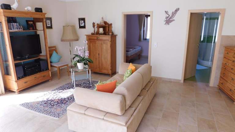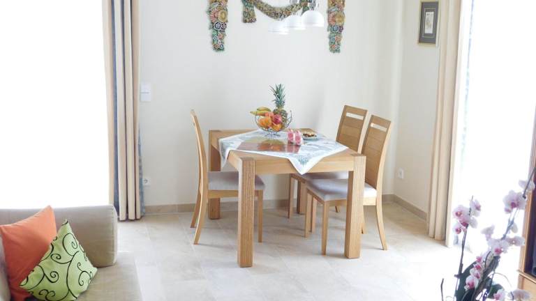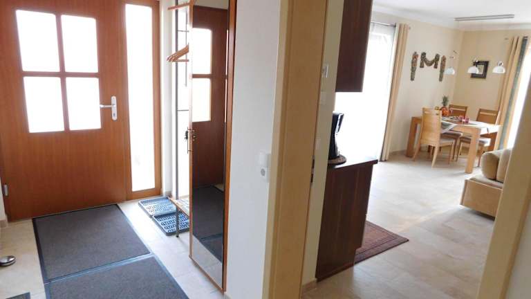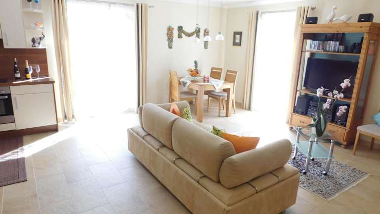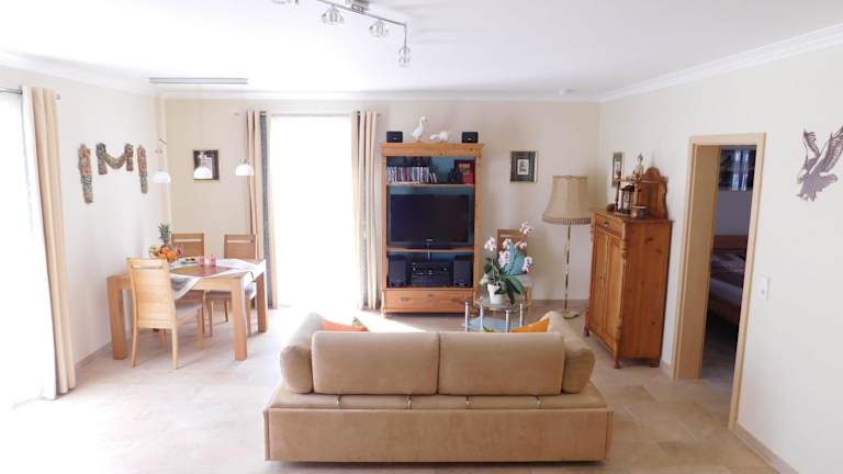 Die Ferienwohnung verfügt über ein separates Schlafzimmer, eine voll ausgestattete Küchenzeile mit Kühlschrank und Geschirrspüler sowie ein Badezimmer. Handtücher und Bettwäsche werden zur Verfügung gestellt. Die Ausstattung umfasst zudem WLAN, Heizung und Gartenmöbel.