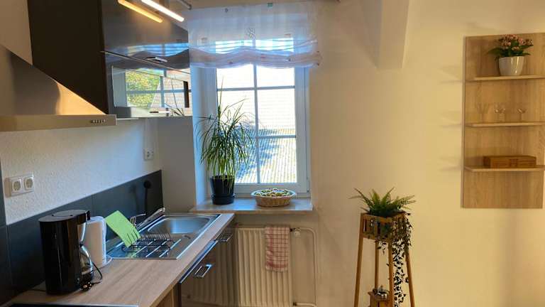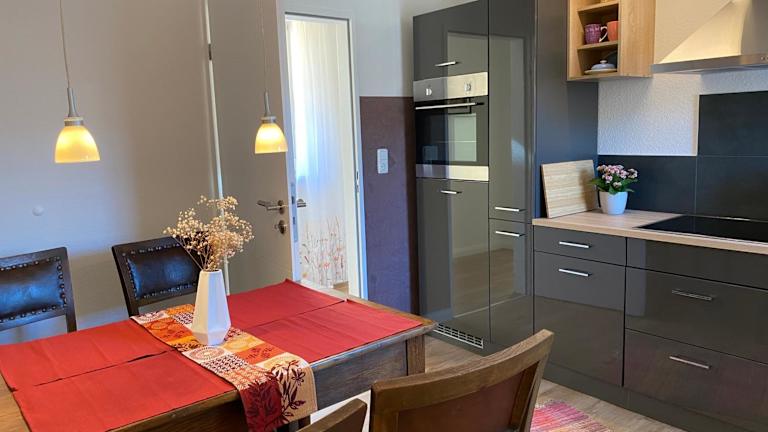 Die Ferienwohnung verfügt über eine voll ausgestattete Küche mit Kühlschrank und Kaffeemaschine, die eine Selbstverpflegung ermöglicht. Auf Anfrage kann ein Essenslieferdienst organisiert werden, sodass Gäste in der Unterkunft Speisen erhalten können.
