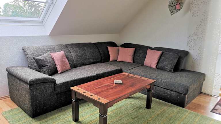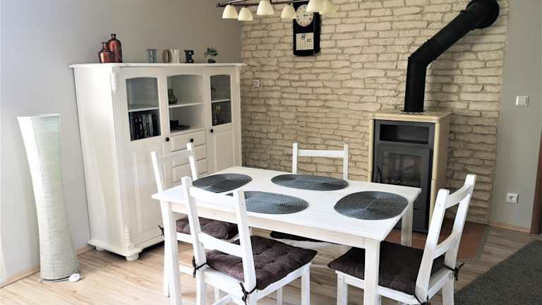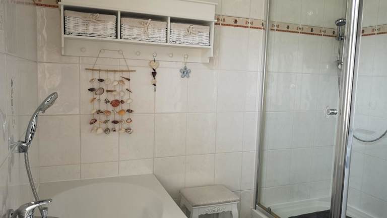 Die voll ausgestattete Küche der Ferienwohnung verfügt über einen Kühlschrank, einen Geschirrspüler, eine Mikrowelle, einen Toaster sowie eine Kaffeemaschine und einen Wasserkocher. Es gibt zudem einen Essbereich für die gemeinsame Nutzung der Mahlzeiten.