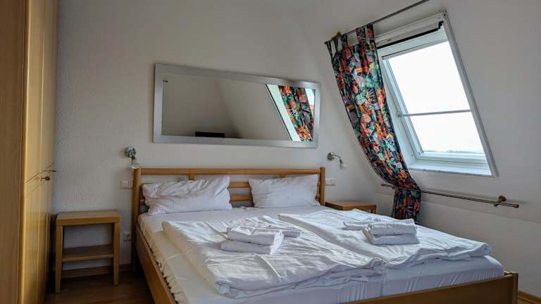 Die Ferienwohnung verfügt über zwei Schlafzimmer sowie eine Küche, die mit einem Kühlschrank und einem Geschirrspüler ausgestattet ist. Es sind zwei Badezimmer vorhanden, die jeweils mit einer Dusche ausgestattet sind. Auf Wunsch können gegen Aufpreis Handtücher und Bettwäsche bereitgestellt werden.