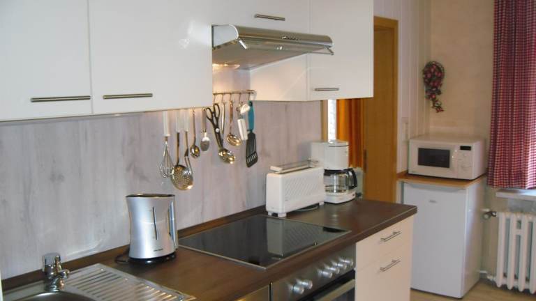 Die Ferienwohnung verfügt über eine voll ausgestattete Küchenzeile mit einem Kühlschrank, einer Herdplatte, einem Toaster, einer Kaffeemaschine und einem Wasserkocher. Es steht ein Grill zur Verfügung.