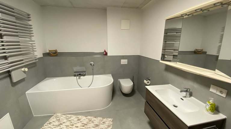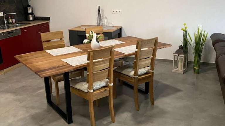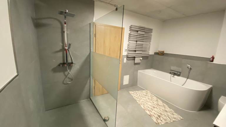 Die Ferienwohnung umfasst ein Schlafzimmer, ein Wohnzimmer und eine voll ausgestattete Küche mit Kühlschrank und Kaffeemaschine. Zusätzlich gibt es ein Badezimmer mit Dusche und Badewanne, und Handtücher sowie Bettwäsche werden bereitgestellt.