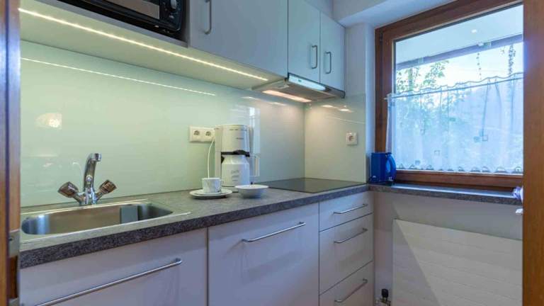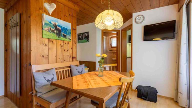Die Ferienwohnung umfasst ein Schlafzimmer und ein Badezimmer. Zur Ausstattung gehören Bettwäsche, Handtücher, ein Flachbild-TV, ein Essbereich sowie eine voll ausgestattete Küche. Eine Terrasse mit Blick auf die Berge rundet das Angebot ab.