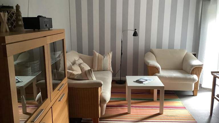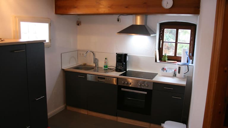 Die voll ausgestattete Küchenzeile in der Ferienwohnung ermöglicht den Gästen die Zubereitung eigener Mahlzeiten. Es stehen Kühlschrank, Geschirrspüler, Waschmaschine, Ofen und Herdplatte zur Verfügung.
