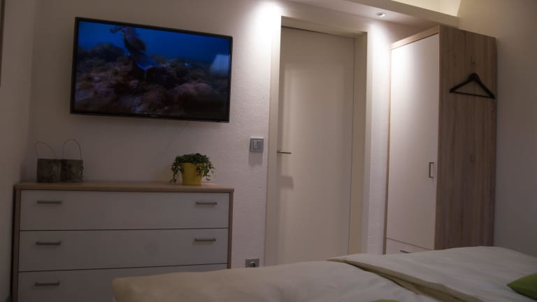 In der Ferienwohnung finden Sie einen 50 Zoll Flat-Fernseher sowie einen zweiten Fernseher im Schlafzimmer. Außerdem ist der Wohnbereich ausgestattet mit einem BluRay- und DVD-Player, einer Playstation 3 und einer Stereoanlage (mit Radio, CD, USB-Eingang und ipod-Dockingstation).