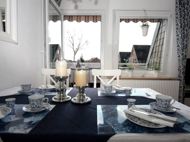 Beschreibung von 'Bisschen schicker.........!!! in Büsum, Deutschland Südbalkon, separate Küche mit Geschirrspüler, Waschmaschine in der Whg., WLAN Exklusive, lichtdurchflutete, 3-Zimmer Ferienwohnung (ca. 70qm) mit schönem Süd-Balkon und Wiesenblick. (klassifiziert mit 5 Sternen des DTV) Die Wohnung befindet sich in einem 2-Familienhaus, liebevoll und hochwertig ausgestattet und dekoriert. Im ganzen Wohnbereich sind weisse, hochwertige Feinsteinzeugfliesen verlegt und verleihen der Wohnung schon im geräumigen Flur einen besonderen Charme. Das schöne, lichtdurchflutete Wohnzimmer ist in klassischem weiss und dunkelblau gehalten, mit grossem Fenster + Balkonzugang. Vom Südbalkon haben Sie einen traumhaft schönen und freien Blick ins Grüne. 2 gemütlichen Sofas (eins davon Schlafcouch für 2 Personen), Couchtisch, einen grossen Esstisch für 4-6 Personen, Sony-Flachbildfernseher 42 Zoll, Stereoanlage, DVD-Player. Bücher und Gesellschaftsspiele laden zum gemütlichen Verweilen ein. Ein dimmbarer Kronleuchter sorgt für romantische Abende. Hier ist es eben ein "bisschen schicker" ;-). Das grosse, weisse Schlafzimmer im romantischen Landhausstil mit Doppelbett (180x200), komfortablen Federkernmatratzen, Daunendecken und -kissen, übergrossen Bettdecken (155x220), Kronleuchter und Babybett, sowie geräumigem Kleiderschrank, verfügt ebenfalls über ein grosses Fenster mit Balkonzugang, Ein gemütlicher Lesesessel rundet das Profil dieses liebevoll in weiss-rosa dekorierten Raumes ab. Das 2. Schlafzimmer, ebenfalls im Landhausstil (weiss-türkis) mit 2 grossen Einzelbetten (100X200) und auch mit übergrossen Bettdecken (155/220) und Bonell-Federkernmatratzen, Daunendecken und Kissen, Kronleuchter, Kleiderschrank und Lesesessel bietet ebenfalls ausreichend Platz, Gemütlichkeit und Helligkeit. Selbstverständlich sind die Betten bei Ihrer Ankunft bezogen, wenn sie dies wünschen. Die separate, helle Einbauküche mit Kühlschrank, Backofen, Herd, Mikrowelle, Dunstabzugshaube und Geschirrspüler ist komplett für 6 Personen ausgestattet und hat einen kleinen Essplatz. Toaster, Wasserkocher, Eierkocher und Kaffeemaschine sind vorhanden. Das Bad ist neu und mit hochwertigem Marmorfussboden gefliesst. Eine Badewannen-/ Duschkombination mit Regendusche sorgt für das perkfekte Wellnessbad. Natürlich mit Fenster. Kuschelige Handtücher in Hotelqualität sind in ausreichender Stückzahl vorhanden. Im Abstellraum der Wohnung finden Sie Ihre Waschmaschine und neben Staubsauger, Putzutensilien und Kinderstuhl ist genug Platz zum Abstellen des Reisegepäcks. Hier haben Sie auch einen eingebauten Tresor. Der Balkon hat einen Tisch und Stühle für 4 Personen.