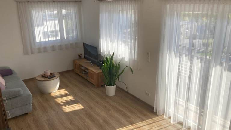 Die Ferienwohnung verfügt über ein Schlafzimmer, ein Wohnzimmer mit Flachbild-TV, eine gut ausgestattete Küche mit Kühlschrank und Geschirrspüler sowie ein Badezimmer mit Dusche. Handtücher und Bettwäsche werden zur Verfügung gestellt. Ein Balkon bietet zusätzlichen Platz und Perspektive auf die umgebende Landschaft.