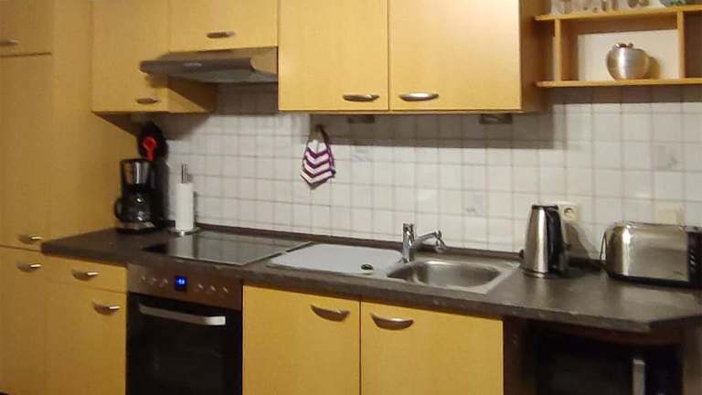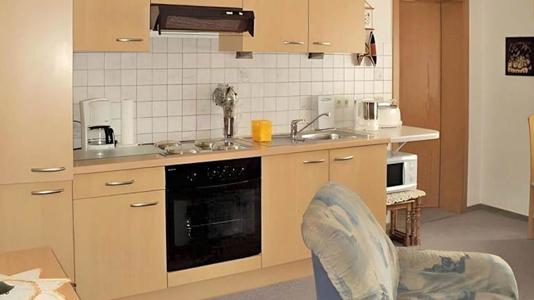 Die Ferienwohnung bietet ein Schlafzimmer, eine gut ausgestattete Küche mit Kühlschrank und Ofen sowie ein Wohnzimmer. Ein Flachbild-TV ist ebenfalls vorhanden.