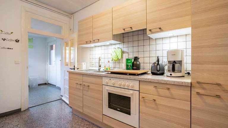Die Unterkunft bietet eine voll ausgestattete Küche mit Kühlschrank, Geschirrspüler, Ofen, Mikrowelle, Herdplatte, Toaster, Kaffeemaschine und Wasserkocher.