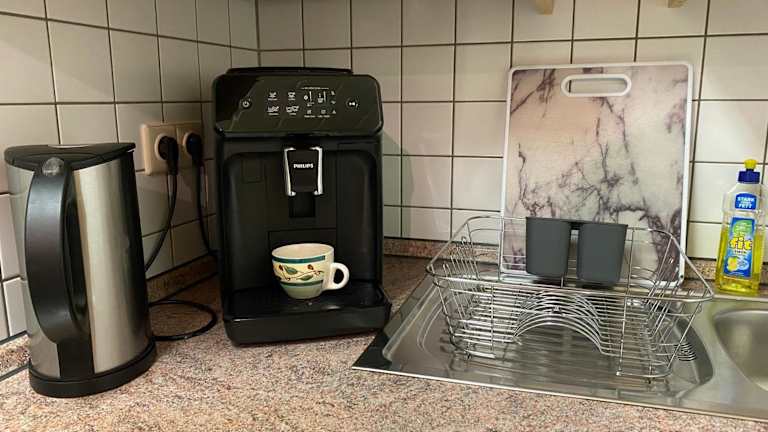 In der Ferienwohnung steht eine komplette Küchenausstattung zur Verfügung, die einen Kühlschrank, eine Mikrowelle, eine Herdplatte und eine Kaffeemaschine umfasst, sodass Selbstversorgung möglich ist. Restaurants oder weitere Verpflegungsmöglichkeiten werden nicht erwähnt.
