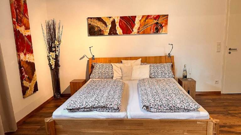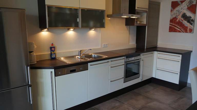 Die Ferienwohnung umfasst ein Schlafzimmer, ein Wohnzimmer und eine gut ausgestattete Küche, die mit einem Kühlschrank und einem Geschirrspüler ausgestattet ist. Handtücher und Bettwäsche werden zur Verfügung gestellt.