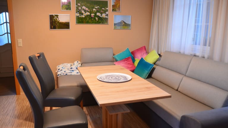 Wir bieten Ihnen eine liebevoll ausgestattete Ferienwohnung für bis zu 5 Personen am Fuße des 'Staatzer Berges'. Die Wohnung besteht aus einer großen Wohn-Küche mit ausziehbarer Bank (integrierte Matratze) für 2 Personen, einem Schlafzimmer mit Doppelbett und zusätzlichem Schlafsofa, einem großen Badezimmer mit Badewanne inkl. Dusche und Waschmaschine, einer seperaten Toilette, einem großen Schrankraum und einem Abstellraum im Eingangsbereich. Sie dürfen natürlich unseren gemütlichen Innenhof inkl. Grillplatz gerne mitbenutzen. Im Garten können Sie unter anderem auch Tischtennis oder Federball spielen. Ganz in unserer Nähe gibt es, abgesehen von vielen Sehenswürdigkeiten und Museen, auch viele Rad- und Wanderwege. Wir würden uns freuen, Sie als Gäste bei uns begrüßen zu dürfen!