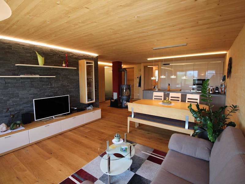 Die Ferienwohnung verfügt über eine eigene Küche mit Kühlschrank, Geschirrspüler und Ofen sowie einen Essbereich im Wohnzimmer.