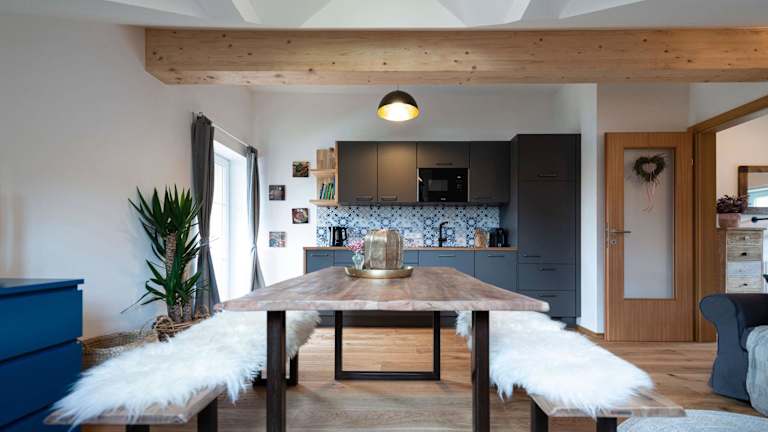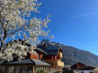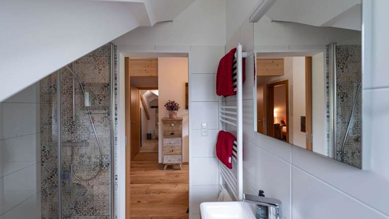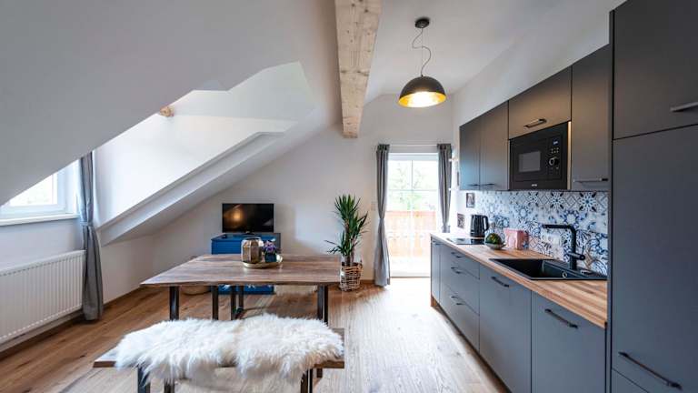 Die Ferienwohnung bietet zwei Schlafzimmer, ein Wohnzimmer, ein Badezimmer mit Dusche und eine gut ausgestattete Küche mit Kühlschrank und Geschirrspüler. Ein Balkon mit Bergblick ist ebenfalls vorhanden. Handtücher und Bettwäsche werden bereitgestellt.