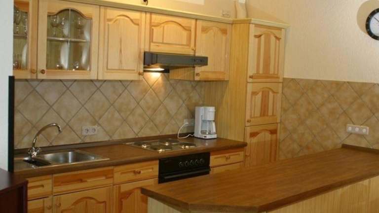 Die Küchenzeile der Ferienwohnung ist mit einem Kühlschrank, einem Ofen, einer Mikrowelle, einer Kaffeemaschine und einem Wasserkocher ausgestattet, was die Selbstverpflegung ermöglicht.
