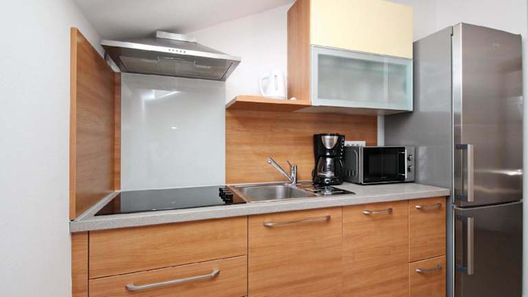Die Küchenzeile der Ferienwohnung ist ausgestattet mit einem Kühlschrank, Geschirrspüler, Ofen, Kaffeemaschine und Wasserkocher, wodurch eine eigenständige Verpflegung ermöglicht wird.