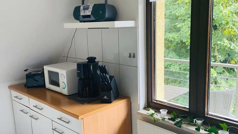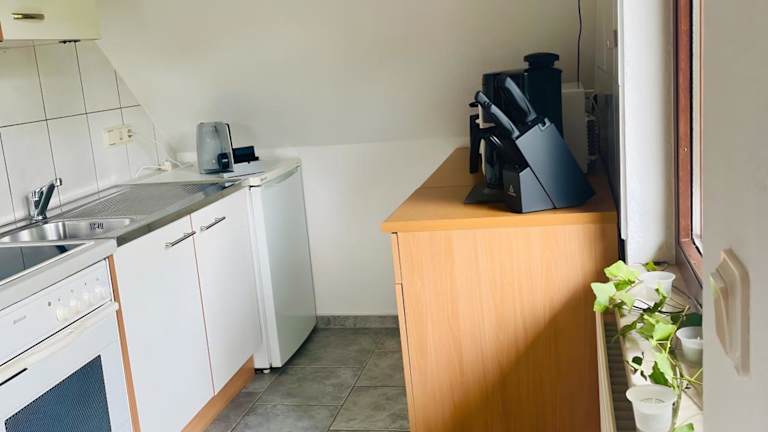 Die Ferienwohnung verfügt über eine voll ausgestattete Küche, in der die Gäste ihre eigenen Mahlzeiten zubereiten können. Zu den bereitgestellten Geräten gehören ein Kühlschrank und eine Kaffeemaschine. Es gibt außerdem einen Grill für die Nutzung durch die Gäste.