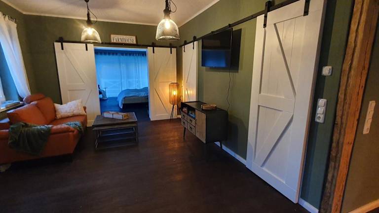 Die Ferienwohnung besteht aus einem Wohnzimmer, einem Essbereich, einem Schlafzimmer und einem Badezimmer mit Dusche. Zur weiteren Ausstattung gehören eine Küchenzeile mit Kühlschrank, Geschirrspüler und Ofen sowie ein Blu-ray-Player. Handtücher und Bettwäsche werden bereitgestellt.