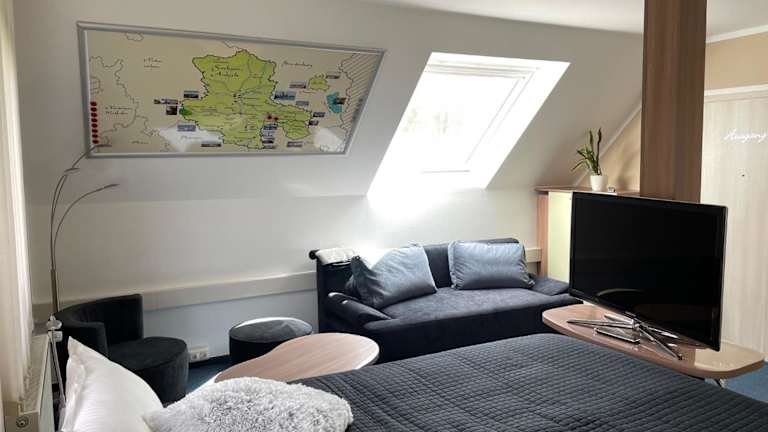 Die Ferienwohnung Geyer bietet Ihnen ein komfortables Apartment mit einem Schlafzimmer. Das Apartment verfügt über eine Klimaanlage, einen Flachbild-Sat-TV und ein gemütliches Wohnzimmer. Die gut ausgestattete Küche ermöglicht es Ihnen, Ihre eigenen Mahlzeiten zuzubereiten. Genießen Sie den Blick auf den Garten von der Terrasse aus und nutzen Sie die kostenfreien Privatparkplätze.