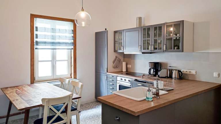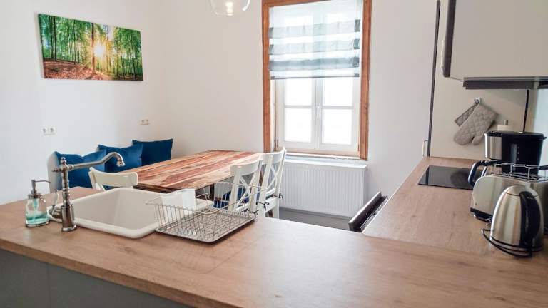 Die Ferienwohnung beinhaltet eine voll ausgestattete Küche, die mit einem Kühlschrank und einer Kaffeemaschine ausgestattet ist. Es stehen keine weiteren Verpflegungsmöglichkeiten zur Verfügung.