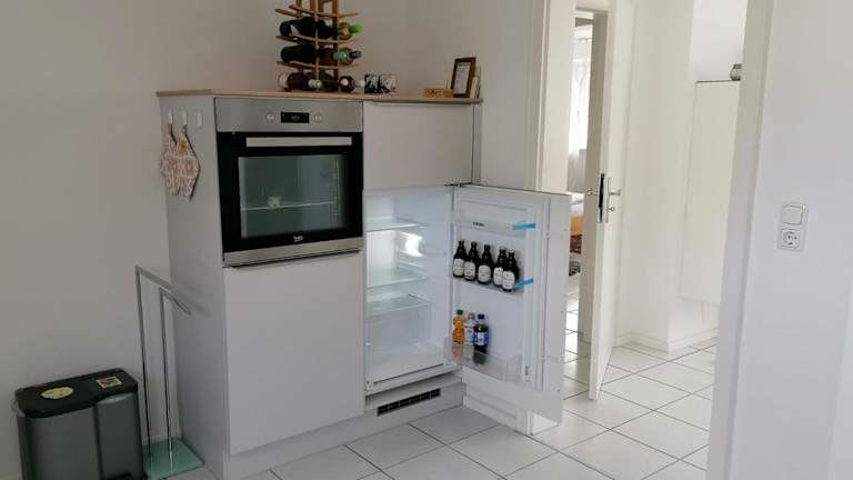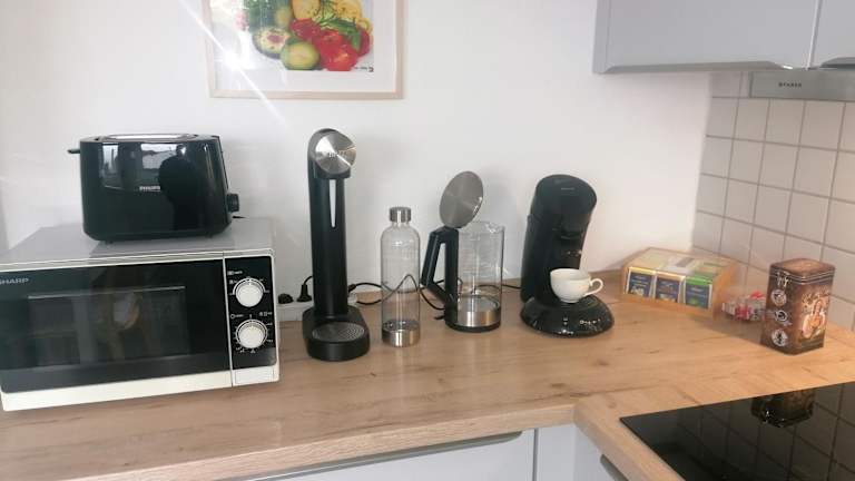 Die Ferienwohnung besteht aus einem Schlafzimmer, einem Wohnzimmer und einer voll ausgestatteten Küche. Diese ist mit einem Kühlschrank und einer Kaffeemaschine ausgestattet. Außerdem gibt es ein Badezimmer mit einer Dusche und kostenlosen Pflegeprodukten. Handtücher und Bettwäsche werden bereitgestellt.