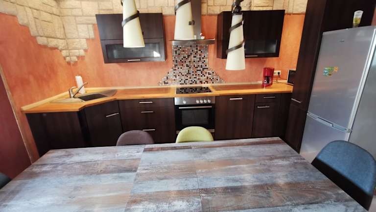 Die Ferienwohnung verfügt über 3 Schlafzimmer, ein Wohnzimmer sowie eine voll ausgestattete Küche mit Kühlschrank und Kaffeemaschine. Es stehen 2 Badezimmer mit Dusche zur Verfügung. Handtücher und Bettwäsche werden bereitgestellt.