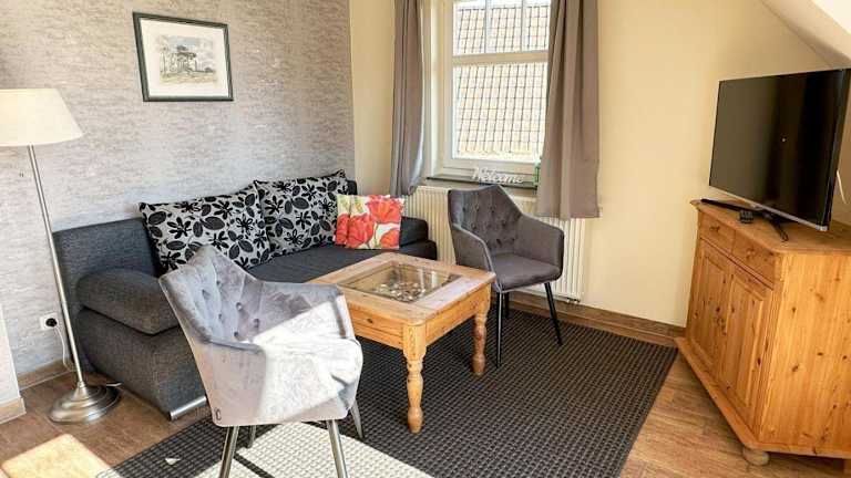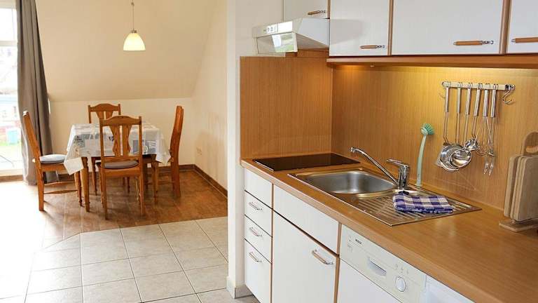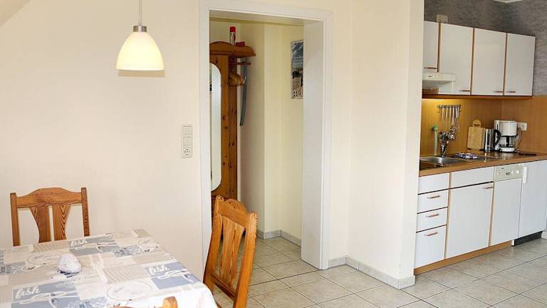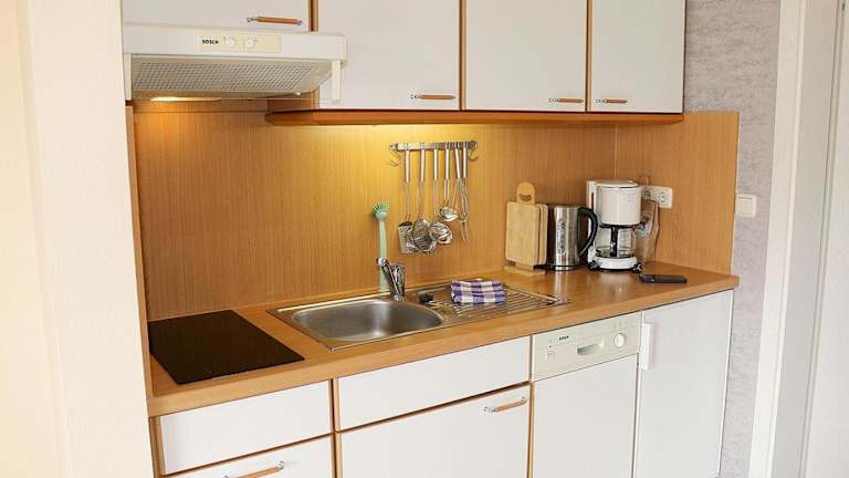 Die Ferienwohnung verfügt über ein Schlafzimmer und bietet ein Wohnzimmer, das mit einem TV ausgestattet ist. Die kleine Küchenzeile ist voll ausgestattet und enthält einen Kühlschrank sowie einen Geschirrspüler. Das Badezimmer ist mit einer Dusche ausgestattet.