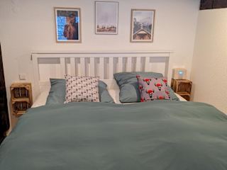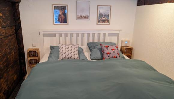 Die Ferienwohnung umfasst ein Schlafzimmer, das Zugang zu einem Balkon bietet. Es stehen Handtücher und Bettwäsche zur Verfügung. Zudem haben die Gäste Aussicht auf die Berge und den Garten.