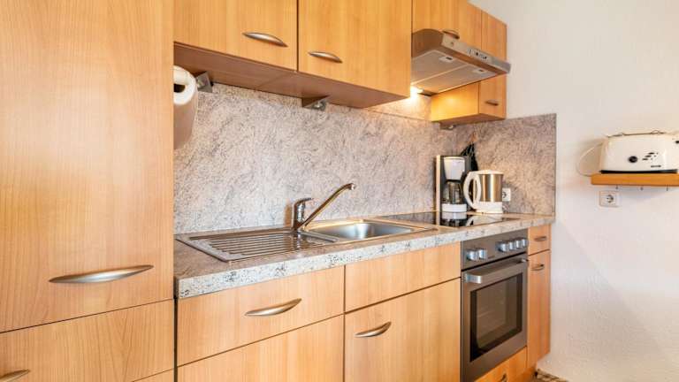 Die Ferienwohnung umfasst eine gut ausgestattete Küche mit Kühlschrank, Geschirrspüler und Ofen sowie ein Badezimmer mit Dusche und Haartrockner. Satelliten-TV ist ebenfalls vorhanden.