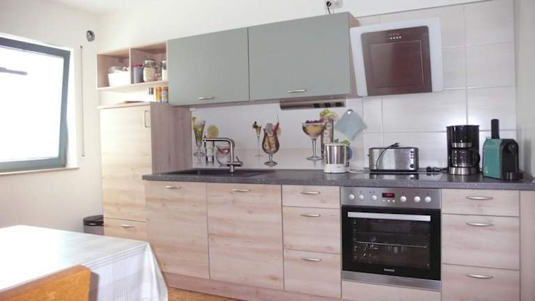 Die Ferienwohnung verfügt über eine voll ausgestattete Küche mit Kühlschrank und Kaffeemaschine.