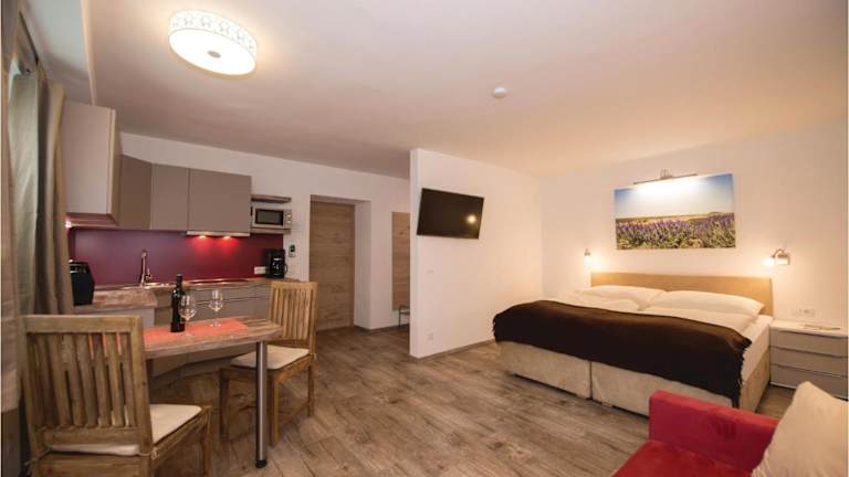 Die Ferienwohnung umfasst 1 Schlafzimmer und ein Wohnzimmer. Sie verfügt über eine voll ausgestattete Küche, die mit einem Kühlschrank und einer Kaffeemaschine ausgestattet ist. Des Weiteren bietet sie 1 Badezimmer mit einer Dusche.