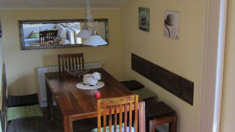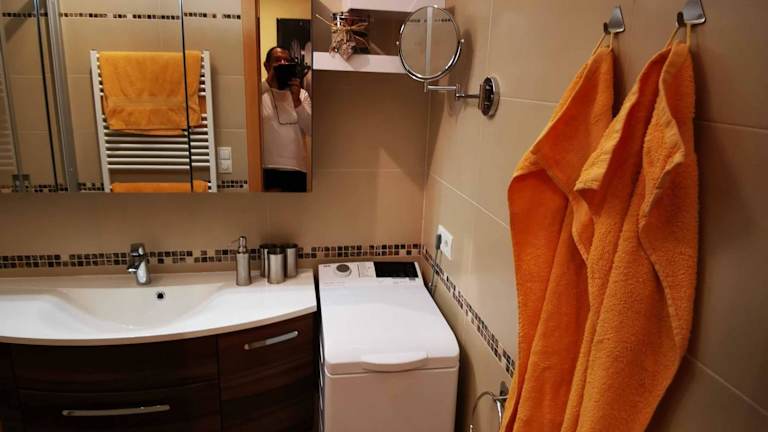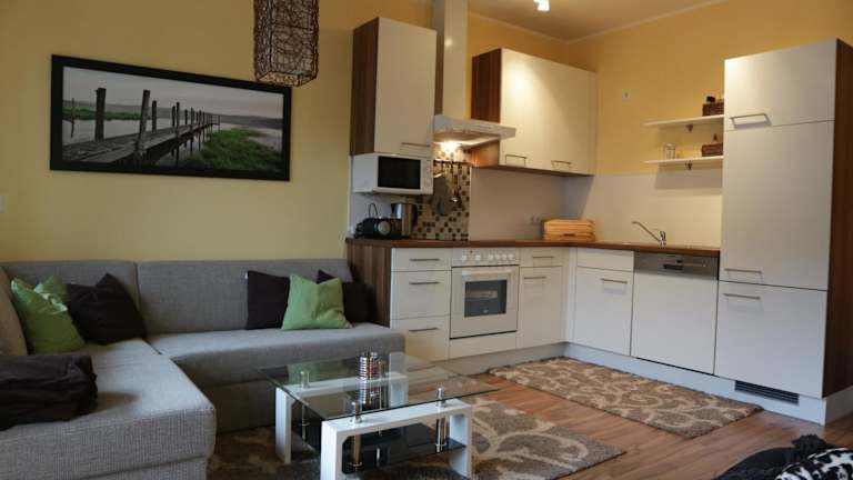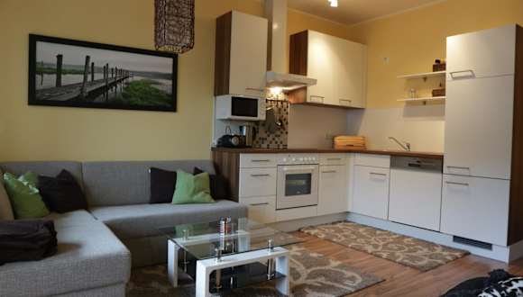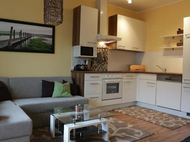 Die Ferienwohnung umfasst zwei Schlafzimmer sowie ein Wohnzimmer und verfügt über einen Balkon mit Blick auf die Berge. Eine gut ausgestattete Küche mit Kühlschrank und Geschirrspüler ist vorhanden. Das Badezimmer ist mit einer Dusche ausgestattet. Handtücher und Bettwäsche werden gestellt.