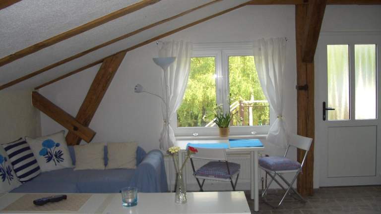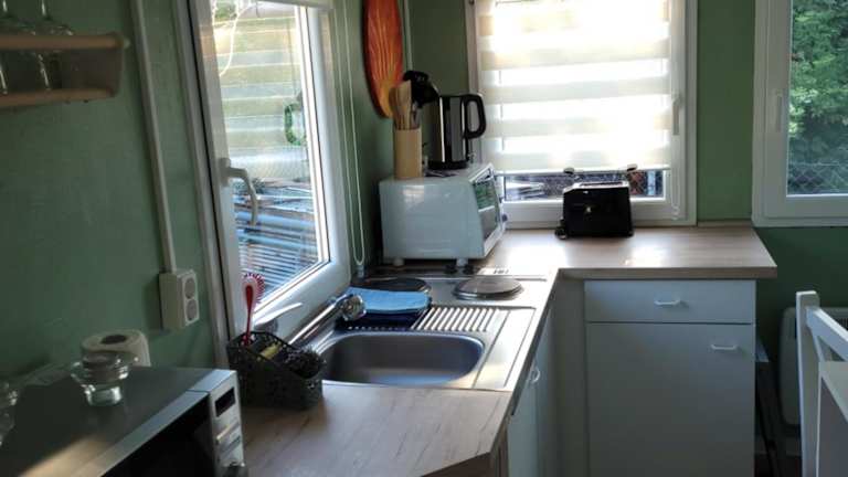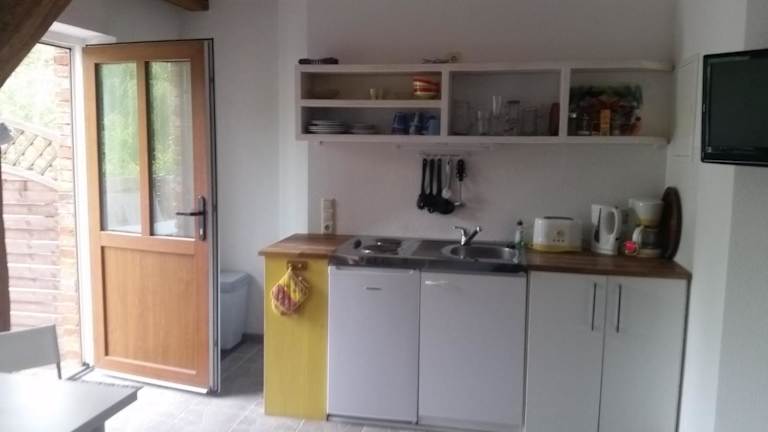 Die Ferienwohnung ist mit einer voll ausgestatteten Küchenzeile ausgestattet, die einen Kühlschrank und eine Kaffeemaschine umfasst. Das eigene Badezimmer verfügt über eine Dusche. Handtücher und Bettwäsche können gegen Aufpreis bereitgestellt werden.