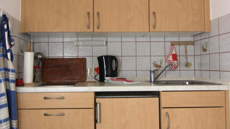 Die Küchenzeile der Ferienwohnung ist mit einem Kühlschrank, einem Ofen, einer Mikrowelle sowie einer Kaffeemaschine und einem Wasserkocher ausgestattet. Es sind keine weiteren Informationen zu Verpflegungsmöglichkeiten vorhanden.