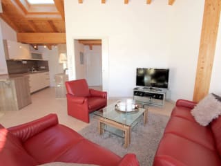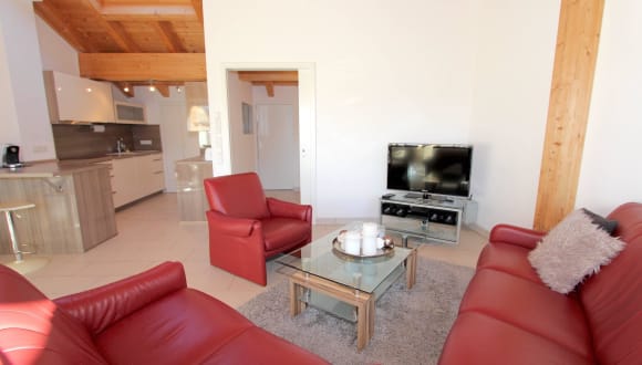 Genießen Sie unvergessliche Tage in der ganz neuen Ferienwohnung auf 145 qm über 2 Etagen. Im großzügigen Wohn- und Essbereich sind genügend bequeme Sitzmöglichkeiten zum gemeinsamen Essen am komfortablem Esstisch oder zum Relaxen vor dem großen Flachbildschirm und zum Genießen der Stereoanlage mit CD/ DVD-Player vorhanden. Von hier erreichen Sie die große Dachterrasse, welche durch ihre Westausrichtung den herrlichen Blick auf das Bergpanorama ermöglicht. Die moderne, zum Wohnraum offene Küche wurde von einem Küchenspezialisten entworfen und hochwertig mit Spülmaschine, Herd mit Cerankochfeld und Backofen, Mikrowelle, Kühl- und Gefrierschrank, Kaffeemaschine und vielen Extras ausgestattet. Gönnen Sie sich Ihren ersten Kaffee des Tages an der kleinen angrenzende Frühstückstheke. Auf dieser Etage befindet sich ebenfalls ein eigenes Zimmer zur Aufbewahrung Ihres Reisegepäcks und ein separates WC. Über die innen liegende Treppe erreichen Sie die drei unterschiedlich eingerichtete Schlafzimmer mit Doppelbetten und teilweise direktem Zugang zum eigenen Balkon sowie den beiden angrenzenden Badezimmern mit Dusche bzw. Badewanne, Doppelwaschbecken und Dusche. Auf dieser Etage befindet sich ebenfalls ein separates WC. Die gesamte Wohnung ist mit Fußbodenheizung und elektrischen Rollos ausgestattet. Sie verfügen über einen eigenen kostenfreien Tiefgaragenstellplatz, von welchem Sie mit dem Fahrstuhl direkt Ihre Ferienwohnung fahren können. Waschmaschine und Trockner befinden sich im Waschraum im UG und sind ebenfalls kostenfrei nutzbar. Wir bitten um Verständnis, dass Tiere hier nicht erlaubt sind und es sich um eine Nichtraucherwohnung handelt. WLAN ist ebenfalls kostenfrei. Wir freuen uns auf Ihre Anfrage!