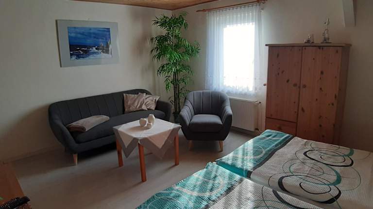 Die Ferienwohnung umfasst ein Schlafzimmer, ein Wohnzimmer sowie eine voll ausgestattete Küchenzeile mit Kühlschrank und Kaffeemaschine. Zudem steht ein Badezimmer mit Dusche und Haartrockner zur Verfügung. Handtücher und Bettwäsche werden gestellt.