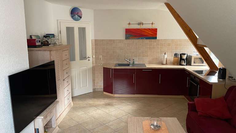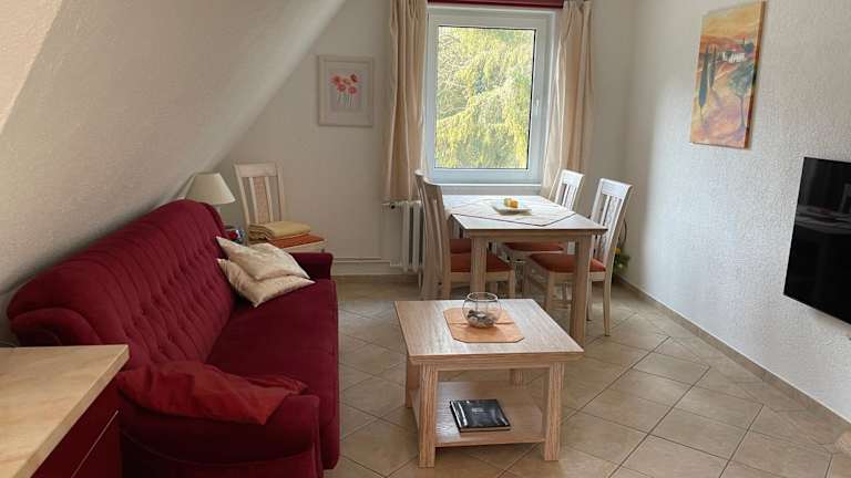 Die Ferienwohnung bietet zwei Schlafzimmer, ein Badezimmer sowie eine voll ausgestattete Küche. Der Wohnbereich umfasst einen Essbereich und einen Flachbild-TV mit Satellitenkanälen. Zudem steht ein Balkon mit Ausblick auf den Garten zur Verfügung. Bettwäsche und Handtücher sind vorhanden.
