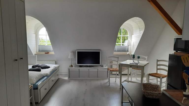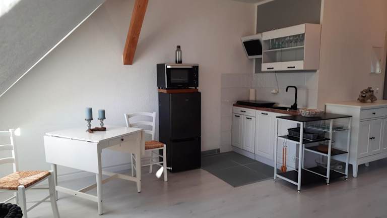 Die Ferienwohnung verfügt über ein Schlafzimmer, ein Wohnzimmer und eine voll ausgestattete Küche, die mit Kühlschrank und Kaffeemaschine ausgestattet ist. Des Weiteren sind ein Badezimmer mit Dusche und Haartrockner vorhanden. Handtücher und Bettwäsche werden bereitgestellt.