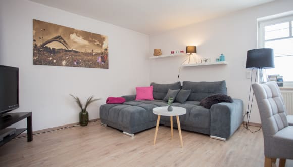 Der Wohnungseingang ist im Erdgeschoss, dort befindet sich ein kleines Gäste WC, die Diele, das großzügige,modern eingerichtete Wohnzimmer mit ausziehbarer Wohnlandschaft und die seperate, komplett eingerichtete Küche. Essgelegenheiten sind in beiden Räumen vorhanden.Im Soutterain befindet sich eine Abstellkammer, das Schlafzimmer mit übergroßem Bett und ein modernes Badezimmer mit Dusche. Auf Wunsch kann ein Kinder/Babybett zugestellt werden. Steckdosensicherungen sind vorhanden. In jedem Raum sind Fenster zum Öffnen. PKW Stellplatz vorhanden.W-Lan kann kostenfrei genutzt werden.