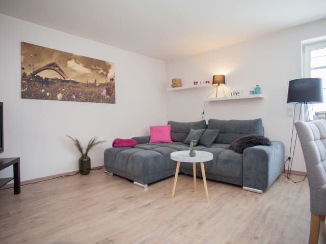 Ankommen und wohlfühlen in der 60 qm großen, kinderfreundlichen, allergikergeeigneten u. zentrumsnahen Ferienwohnung in Waldrandlage ... Im Garten des Hauses lädt ein Pavillion mit Gartenmöbeln und Grill zum verweihlen ein. Für die Kinder lädt ein Kletterturm mit Rutsche/Feuerwehrstange, Spielehäuschen, Turnstange, Sandkasten zum Spielen ein. Trampolin Grill, Laufrad, Roller, Holzschlitten, Schlitten, Bob/Rutscheteller können kostenlos mit genutzt werden.