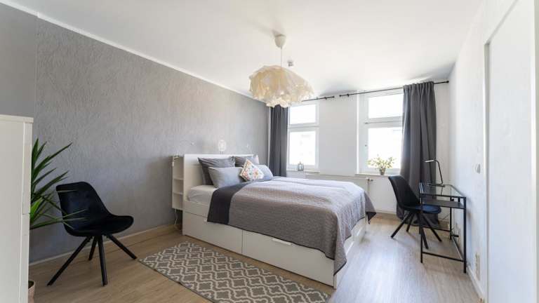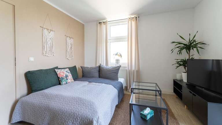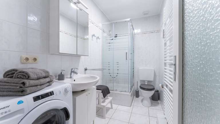 Die Ferienwohnung verfügt über ein Schlafzimmer, eine Küche mit Kühlschrank und Geschirrspüler, einen Flachbild-TV, einen Sitzbereich sowie ein Badezimmer mit Dusche. Handtücher und Bettwäsche werden bereitgestellt.