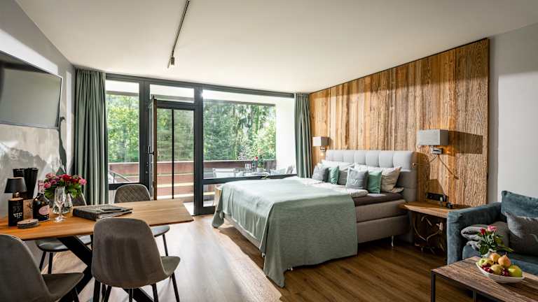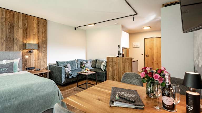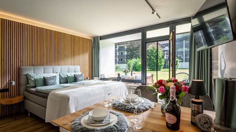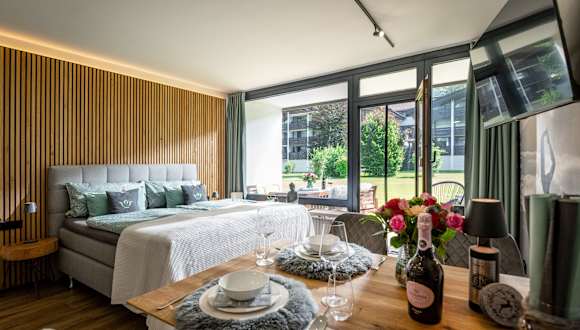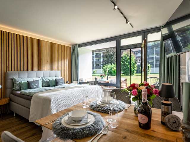 Die Ferienwohnungen im Areal vom Schlosspark Grubhof sind wie ein Studio eingeteilt und bieten Platz für jeweils bis zu 4 Personen. Ein großes Boxspringbett und eine Schlafcouch sind die Schlafmöglichkeiten. Die Küche ist mit Herd, Backofen mit Mikrowelle, Dunstabzug, Geschirrspüler und Kühlschrank voll ausgestattet. Das Bad ist mit einer Dusche, Toilette, Waschbecken und Fön ausgestattet. TV und Wlan sind kostenlos verfügbar. Das Hallenbad und der Fitnessraum können ebenso kostenlos benutzt werden. Es steht wahlweise ein Balkon bzw. eine Terrasse mit Gartenzugang zur Verfügung.