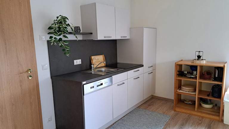 In der Küche der Ferienwohnung sind ein Kühlschrank, ein Geschirrspüler sowie eine Herdplatte vorhanden, was die Selbstverpflegung ermöglicht. Zudem stehen Grillmöglichkeiten zur Verfügung.